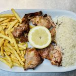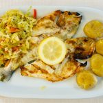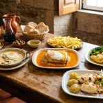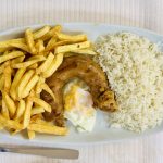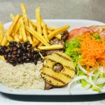 Acompanhada de arroz, feijão preto, ananias, salads e batatas fritas