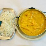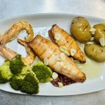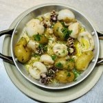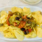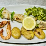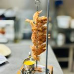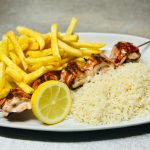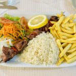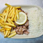 Pequenos pedaços de carne de porco e bovina com molho especial.