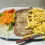 Acompanhado de ovo estrelado, batatas fritas e salads ou arroz
