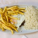Acompanhado de ovo estrelado, arroz e batatas fritas